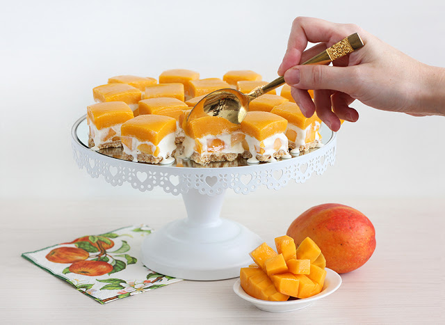 יוצקים לקערה חלב מרוכז. מקציפים במערבל חשמלי שמנת להקצפה לקצפת יציבה, ומקפלים פנימה. מוסיפים קוביות מנגו ומקפלים קלות להטמעה. יוצקים על התחתית, ומעבירים להקפאה ל-6 שעות עד לילה להתייצבות. בינתיים אפשר להכין את סורבה המנגו, שדורש קירור נפרד בפני עצמו.