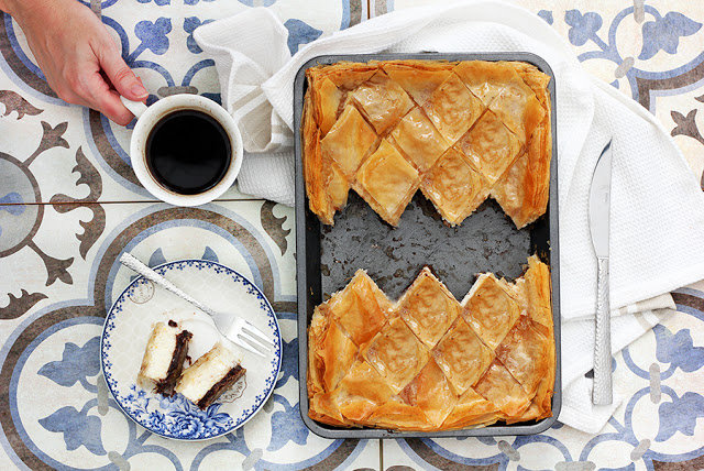 כן! ספק בקלאווה ספק עוגת גבינה חמה, במאפה הזה את עלי הפילו הפריכים והמתפצפצים, מברישים בחמאה מומסת מעורבת בקינמון, וממלאים בשכבה של ממרח תמרים, ובמלית גבינת ריקוטה וגבינה כחושה, מבושמת בקליפה מגוררת של תפוז ושל לימון המעניקות למלית טעם הדרי וניחוח נפלא. שתי הגבינות דלות בשומן אך עשירות במרקם עדין, מיוחד ומעט גרגירי, טעם של פעם שמיד מחזיר לילדות. ואם זה לא מספיק, כמו כל בקלאווה, גם כאן המאפה כולו מקבל אליו באהבה בתום האפייה סירופ סוכר מבושם, שנספג בו לאט לאט ומעניק מתיקות מעודנת, לחות וטעם נפלא.