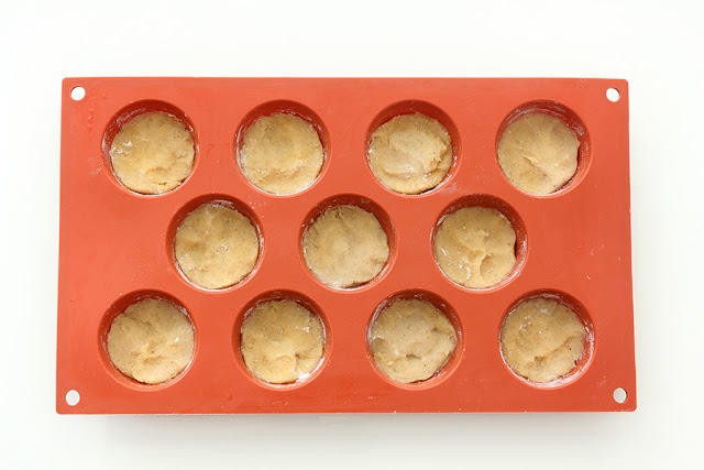 מחממים תנור ל-180 מעלות. מחלקים את הבצק ל-12 כדורים (הוא יהיה עדיין רך וזה בסדר) ומשטחים כל כדור בעזרת האצבעות בתבנית סיליקון מיני מאפינס לשכבת בצק שמנמנה בגובה של סנטימטר. אופים את הבצק 15 דקות להשחמה יפה. מוציאים את התבנית מהתנור, ובעוד הבצק חם יוצרים מיד בכל תחתית בצק גומה גדולה בעזרת כפית פריזיאן לקבלת מראה שמזכיר קלתיות קטנות. מצננים היטב, משאירים את הקלתיות בתוך התבנית.