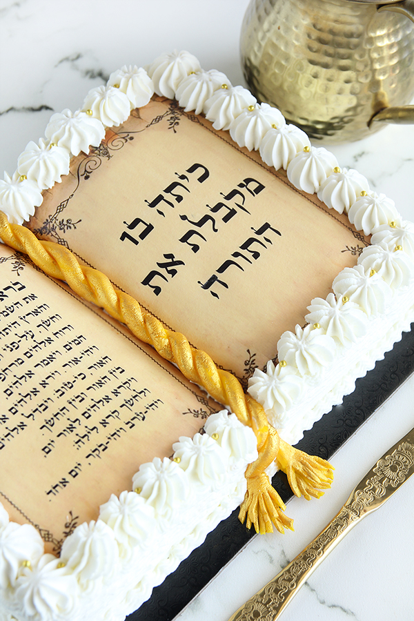 מתקבלת עוגה יפה ומרשימה במיוחד שתתאים למסיבות חומש, לבר מצווה או להכנסת ספר תורה.