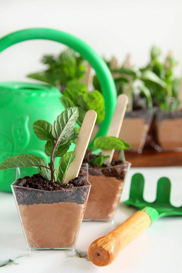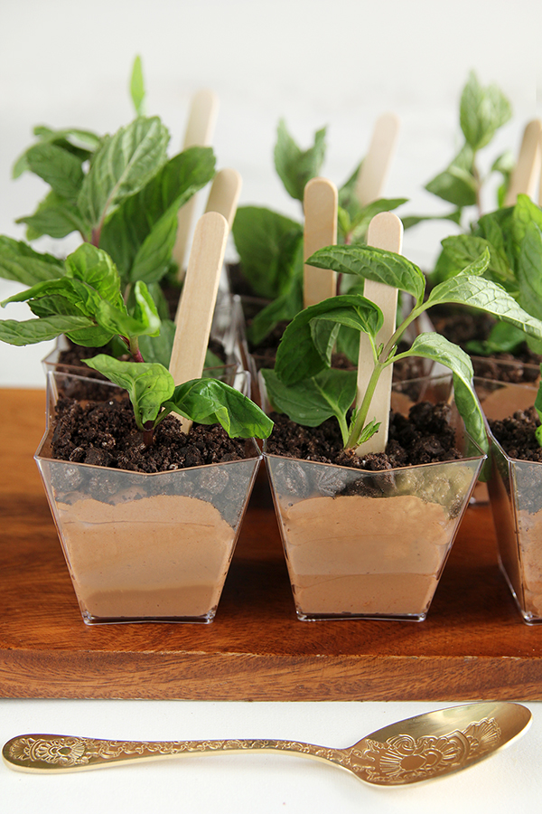 כדי לקבל מראה עציצי, "נוטעים" בתוך כל גביע קרם גבעול של נענע, ומפזרים מעל פירורי עוגיות שוקולד לקבלת מראה של אדמה.