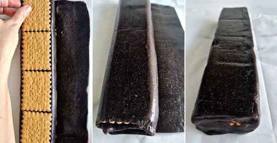 מרדדים את תערובת התמרים על נייר אפייה לעלה דק, ומגלגלים לסירוגין עם ביסקוויטים שלמים.